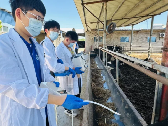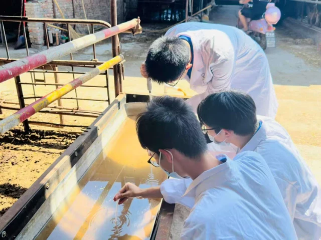 基于前期调研,7月5日实践团携带专业采样设备,对养殖场内外的空气样本及周边水源样本进行多方位、多时段采集,确保样本的代表性与科学性,为精准分析环境状况提供数据支撑。
