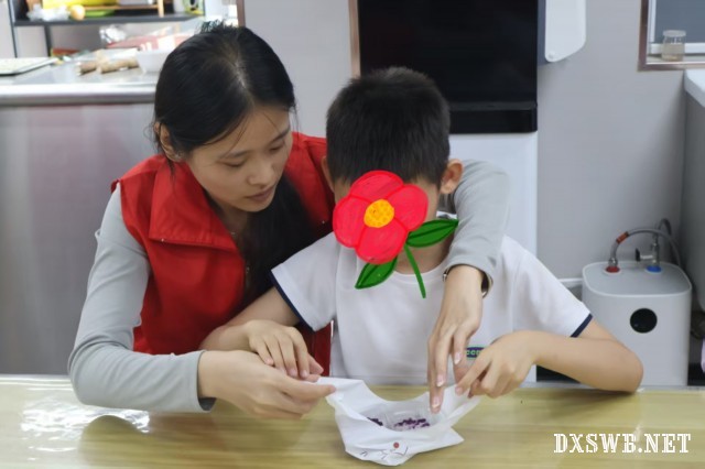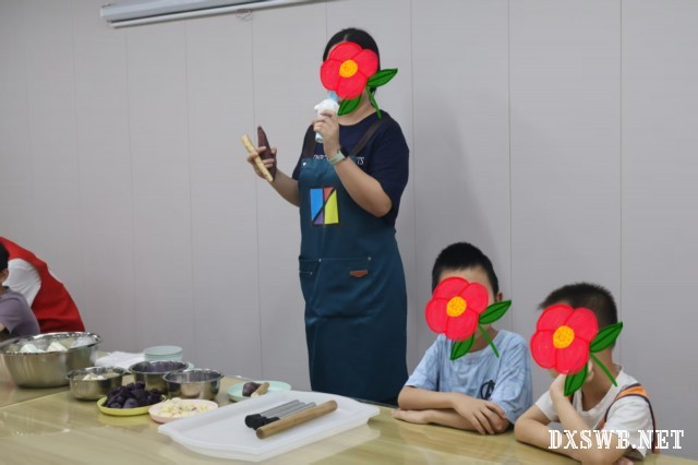 紧接着,老师分步骤示范糕点制作流程。孩子们认真学习,独立完成压泥、塑形等工序。实践团成员主要负责操作提醒和台面整理等工作,确保活动安全有序进行。
