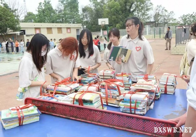 7 月10日上午,实践团在歇马中学操场举行了简朴而温馨的图书捐赠仪式。志愿者们将前期募集的300余册图书分类整理,涵盖文学、科普、历史、励志等多个领域。商学院学工办主任陈攀老师在致辞中表示:“这些书籍不仅是知识的载体,更是爱与希望的传递。希望同学们能从阅读中汲取力量,勇敢追梦。”