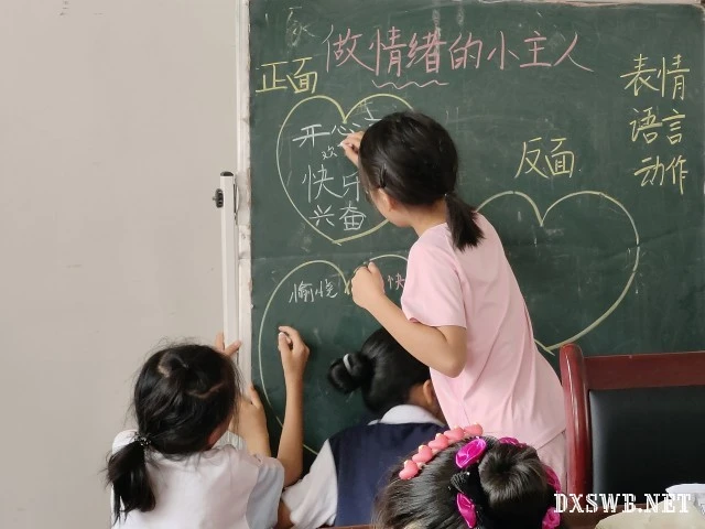 课堂上,辅导老师首先在黑板上绘制了两个醒目的爱心图案,分别标注"正面"和"反面"字样。随后,孩子们踊跃举手,轮流上台在爱心内写下自己了解的情绪词汇。欢快、兴奋、自豪等积极情绪填满了正面爱心,而生气、难过、害怕等消极情绪则出现在反面爱心中。
