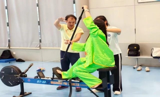 活动中,苏州工学院龙舟队队员向美国学生系统介绍了“龙舟”——这一承载千年历史的中国传统文化符号。从“龙舟的起源传说”到“端午竞渡的民俗意义”,从“船桨的构造原理”到“划行的协作技巧”,队员们通过生动讲解搭配标准示范,将这项古老运动背后的文化内涵娓娓道来。在专业划船机前,美国学生们跃跃欲试,在龙舟队教练的指导下模仿划桨动作。桨叶交替间,不仅是技术的传递,更以体育为桥,增进了两国青年的相互理解,让“真实、立体的中国”在美国青年心中生根,现场欢呼声与水流声交织成独特的友谊乐章。