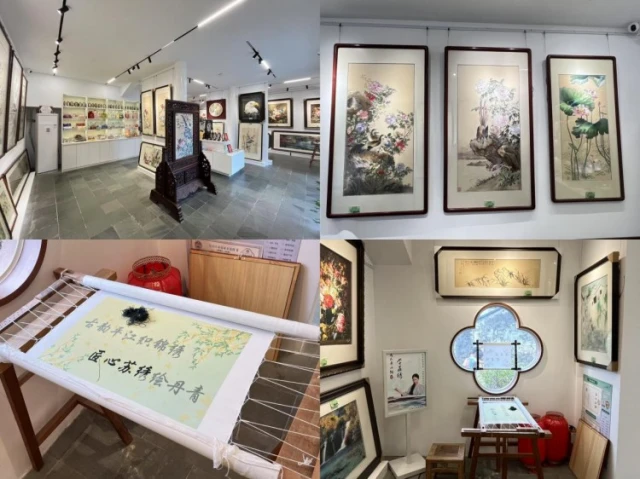 进入场馆,成员们首先被展厅内陈列的精美苏绣作品深深震撼。透过织线,沧桑古朴之力不绝如缕。刺绣上飞龙舞凤,经纬之间是栩栩如生的花鸟鱼虫和气势恢宏的山水画卷。卢福英老师亲自为同学们导览讲解,介绍苏绣的历史、艺术特色、主要针法以及不同流派风格,让大家对苏绣这门“以针作画”的指尖艺术有了更加系统而深刻的认识。