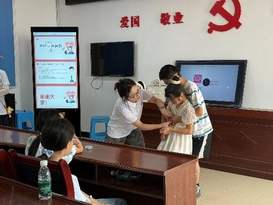 此外,实践团还针对气道异物梗阻问题,教授了海姆立克急救法。通过情景模拟,成员们分别演示了针对成人与儿童操作方式。小朋友们两两一组,互相练习背部叩击和腹部冲击的技巧。一位小朋友在成功完成动作后兴奋地说:“这个办法真的有用!回家我要教给爸爸妈妈。”