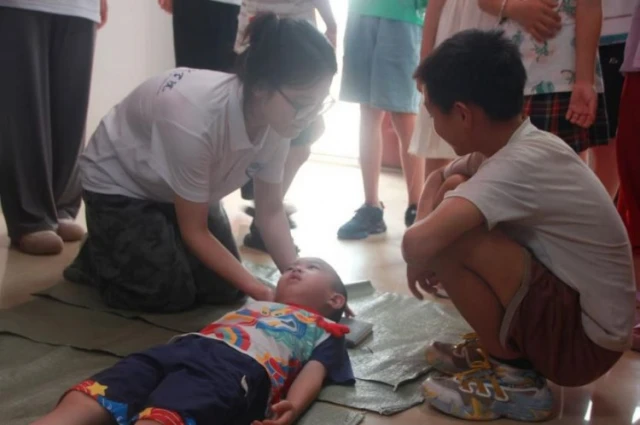 爱国歌声余韵未歇,下午的活动转向关乎生命的实践课堂。志愿者以通俗易懂的语言和模拟演示,向孩子们系统讲解心肺复苏(CPR)与海姆立克急救法的操作要点。“手臂要伸直,用上半身的力量按压!”在专业指导下,孩子们轮流在人体模型上练习胸外按压,学习判断呼吸、定位按压位置、掌握按压深度与频率。针对气道异物梗阻场景,志愿者手把手教授海姆立克法的“剪刀、石头、布”口诀及背部叩击技巧,确保每位孩子理解不同年龄段的施救差异。