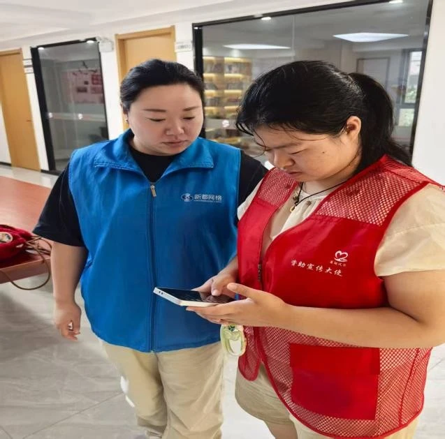 图为志愿者与社区工作人员交流资助事宜。朱慧筠 崔思婧供图