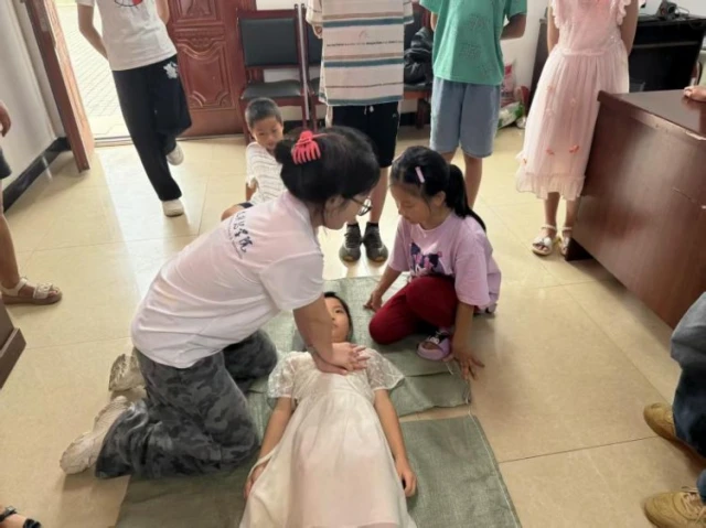 实践队员带来的急救培训课堂一开场,便迅速抓住了伍家村童伴之家孩子们的目光,好奇的小脑袋紧紧围拢。这并非纸上谈兵,而是一场关乎生存技能的实战演练。
