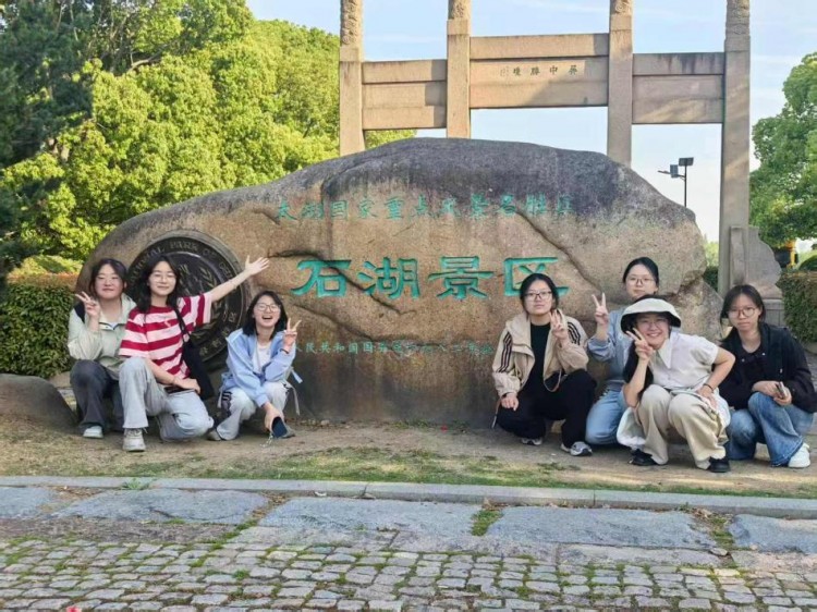图为团队成员在石湖景区实地考察,委托游人手摄,从左至右依次为苏悦、白涵予、陈璐、叶梦、沈一凡、王月庭、周惠玲。白涵予 供图