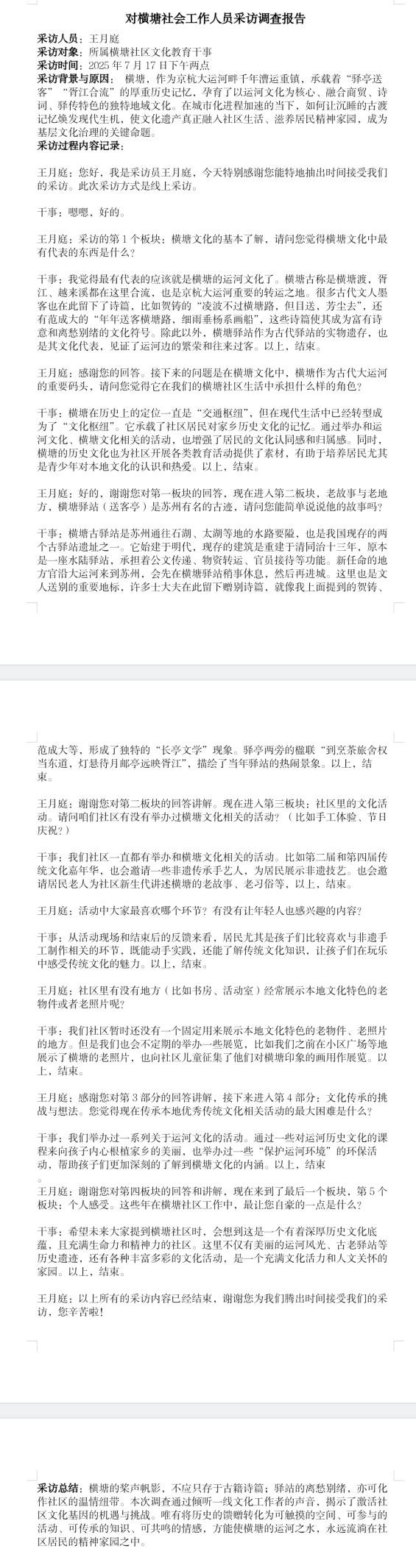 图为团队成员王月庭对苏州市横塘社区文化教育干事进行采访的实录。白涵予 供图