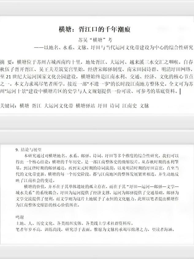 八月初团队长白涵予完成了题为《横塘胥江口的千年潮痕》的学术论文。论文从地名溯源、水系变迁、圩田开发、文学书写等多维度系统梳理了横塘2500年的发展历程。研究表明横塘地处三水交汇咽喉是江南水利、交通、经济与文化的核心节点其演变历程堪称江南整体历史的缩影。论文还结合大运河文化带建设现状提出了文化资源保护与活化的具体建议为地域文化振兴提供了学术支撑。