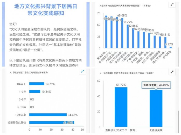 七月下旬团队设计并发放了题为地方文化振兴背景下居民日常文化实践感知的问卷调查共回收有效问卷63份。受访者以1825岁青年为主超七成与江南地区有长期居住或家族渊源显示出对本土文化的天然情感联结。然而近八成受访者表示其工作或学业与本土文化无直接关联反映出文化传承在日常场景中的渗透不足。在获取文化信息的渠道方面生活实践、文旅体验和社交平台占主导传统文化场馆等正式渠道作用有限。这一结果提示文化传播需更加注重日常化和场景化加强与现代生活方式的结合。