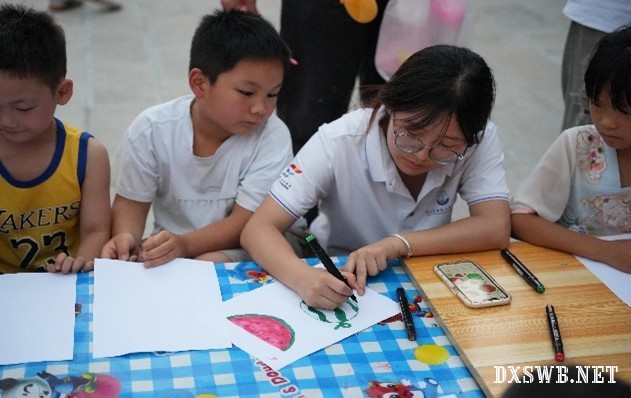 四十多度的高温挡不住实践团成员与孩子们共赴一场艺术之约。我们不仅手把手传授绘画的基本技巧,更以优秀作品为窗、以艺术故事为桥,细细播撒对美的感知与热爱,让孩子们在熏陶中学会感受美、欣赏美、进而勇敢创造美。当画笔在纸上流转,一个个饱满的西瓜、一串串鲜灵的水果跃然纸上,汗水浸湿的衣衫旁,是孩子们亮晶晶的眼睛;而那些画得格外出色的小小创作者,总能收获一份扭扭气球拧成的惊喜——这份在热浪中绽放的艺术启蒙,既有技巧的传递,更有热爱的点燃,让美在欢笑与汗水里扎下了根。