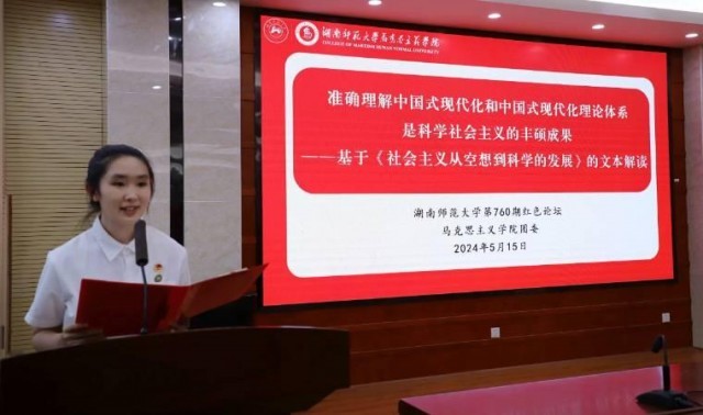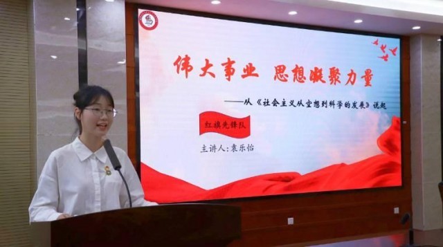 活动伊始,主持人介绍了此次红色论坛的主题及时代背景,全体成员共唱共青团团歌。随后,杨子萱、赵一兰、袁乐怡、郭佳怡四位主讲人结合阅读《社会主义从空想到科学的发展》一书的所思所得,分享了关于“中国式现代化和中国式现代化理论体系是科学社会主义的丰硕成果”的感悟。活动最后,刘先江教授对此次活动进行总结点评,他充分肯定了同学们所分享的阅读感悟,认为同学们在阅读原著的过程当中做到了“三有”——有阅读、有观点、有思考,同时也强调了不仅要多读经典原著,更要完整系统地去读,将所思所悟与生活实际相结合,既要回到过去,也要关注现在、指导未来。