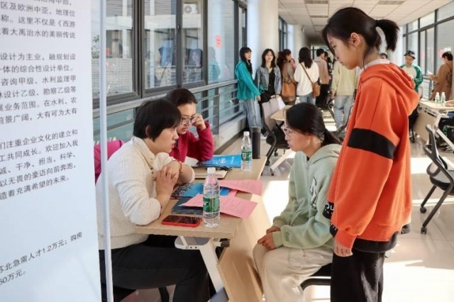 招聘会现场,毕业生们手持简历,积极与用人单位交流,深入了解岗位相关信息。企业代表们也向毕业生详细介绍了公司概况、招聘岗位和福利待遇,了解了同学们相关的实习实践成果,并对未来职业发展路径进行了清晰的讲解。本次招聘会还吸引了低年级的学生前来了解用人单位需求,以便尽早开始职业生涯规划。