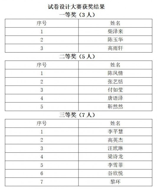 (通讯员:郑浩怡 杨馨蕊)5月17日-24日,数学与统计学学院(以下简称“数统学院”)于线上开展2024年试卷设计比赛,本次活动共有42位同学参赛,其中3人获一等奖,5人获二等奖,7人获三等奖。