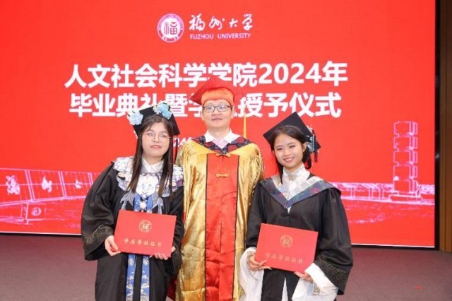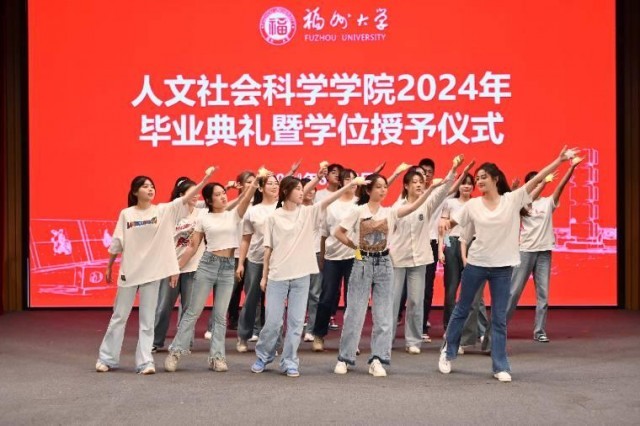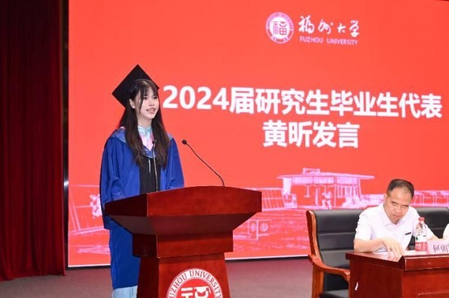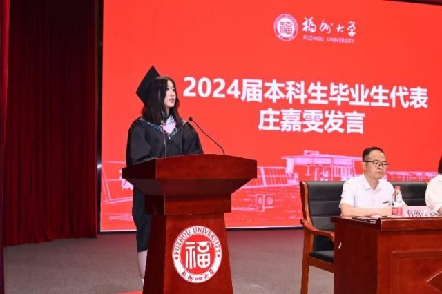 随后,2024届本科毕业生代表庄嘉雯、硕士毕业生代表黄昕发言。她们深情回忆了自己在福大的求学旅程,向师长表达衷心感谢,号召同学们保持热情、不懈努力,在崭新人生征程上,做有思想、有情怀、有温度的人文青年,勇敢追梦、创造辉煌,为社会发展和祖国繁荣贡献力量。