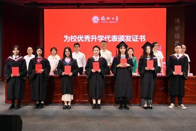 诗朗诵《青春福大》为典礼启幕。庄严奏唱国歌后,学院领导为2024届优秀毕业生代表、本科毕业生升学先进个人代表颁发荣誉证书。