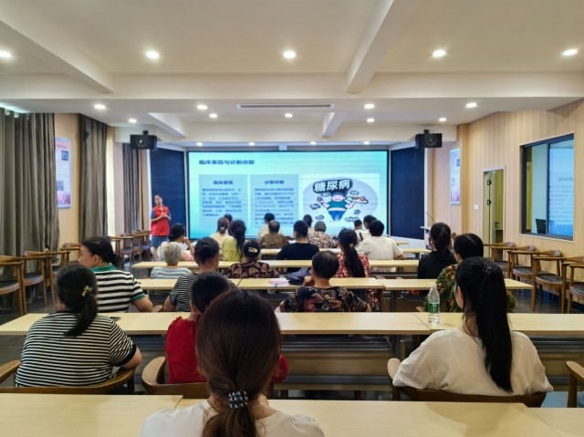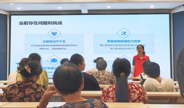 益阳医专的老师为紫薇村的老人们讲解了有关老年人糖尿病管理的危害:老年人是糖尿病的高发人群,其患病率远高于其他年龄段。老年人糖尿病不仅影响血糖水平,还易导致心脑血管疾病、肾脏病变、视网膜病变等多种并发症,严重威胁老年人的生命安全和生活质量。此外,老年人糖尿病的管理还面临着认知不足、治疗依从性差、经济负担重等挑战。图为老师为老年人们讲解糖尿病存在的问题及挑战