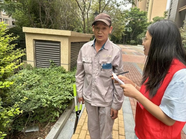 实践团队志愿者采访社区绿化员。大学生网报通讯员 刘院晨 供图