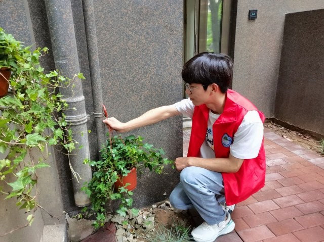 实践团队志愿者在社区中见“缝”插绿。大学生网报通讯员 李朝阳 供图