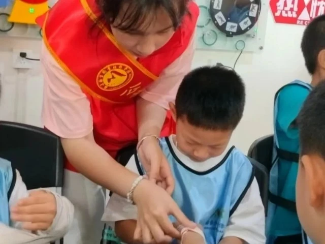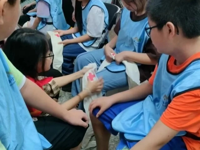 亲手教小孩子们不同的受伤部位如何使用绷带和三角巾进行包扎,小孩子们学习得很是投入。当他们投入了精力和时间就会带来成长和成就感。 心灵海报