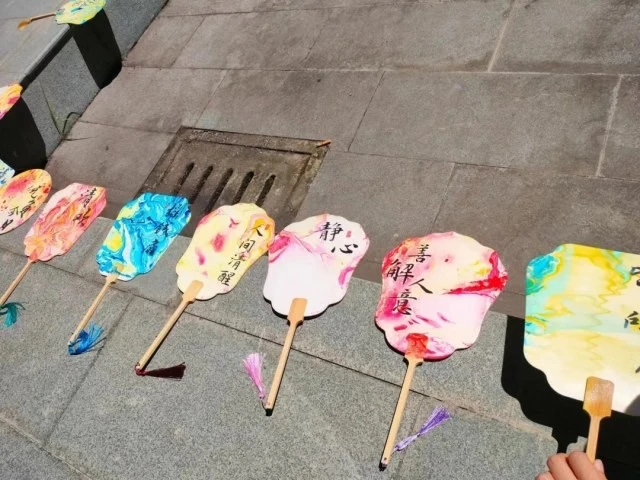 介绍完我国非遗文化——漆扇,我们和小孩子们一起动手制作了漆扇,小孩子们选择了自己喜欢的颜料制作了各色各样的漆扇,因为第一次制作加上漆扇本身特有的魅力,大家都很享受这个过程,最后来个成品展示和具体介绍。
