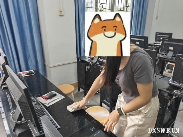 活动正式开始,义工们拿到清洁工具后迅速到达各自负责的区域进行打扫,她们默默穿梭在课桌之间,没有言语交流,只听见扫帚划过地板的声音、抹布拭过桌面的声音。一位义工挥动着扫帚,干脆而有力,每一个角落都不放过。阳光透过窗户洒在地面上,灰尘在光影中跳跃,地面上的垃圾被一一带走,留下的是一片干净。另一位义工专注而利落地擦拭着桌子,不放过键盘底下与鼠标垫底下的位置。抹布在光滑的桌子上滑动,带走灰尘,留下一片洁净,桌面在她的擦拭下逐渐变得光亮。