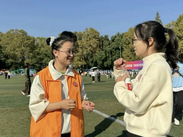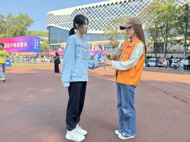 在操场的另一边,女子400米比赛的枪声已然打响。志愿者左小艳目光紧随跑道上的一道道身影,努力为运动员许绘琳加油鼓劲。比赛结束后,左小艳跑上前去搀扶运动员,面对面色发白的运动员,她搀扶运动员进行慢走放松,协助其缓解肌肉酸痛并递上早已准备好的矿泉水。在志愿者的陪同下,运动员逐渐恢复平稳呼吸,主动与志愿者分享比赛体验。