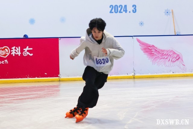 8:00,随着令旗挥动,学生甲组男子150米速滑正式拉开序幕。运动员们猛然蹬地,奔跑加速,向前划出道道冰痕,惯性瞬间让他向前滑行数米。冰刀与冰面频频撞击,荡出清脆有力的声音,宛若胜利的序曲,在体育馆内交叠回响。计算机科学与工程学院22级科学与技术三班孙瑞涛在采访中感叹:“我热爱滑冰运动,滑冰不仅可以让我享受速度与激情,还能锻炼身体,磨练意志。”