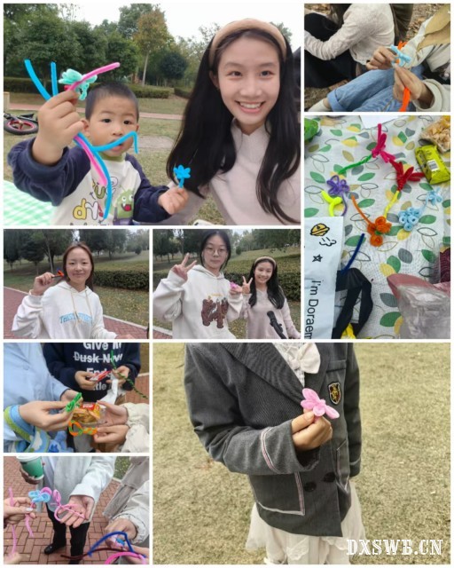 第三个游戏是拍照默契打卡,大家分组按图片摆出对应的姿势,比拼速度和默契度;第四个游戏是老鹰捉小鸡,大家在追逐间欢快玩乐;最后一个游戏是手工公益游戏,大家将自己制作的扭扭棒物品送给路人,传递快乐与温暖。