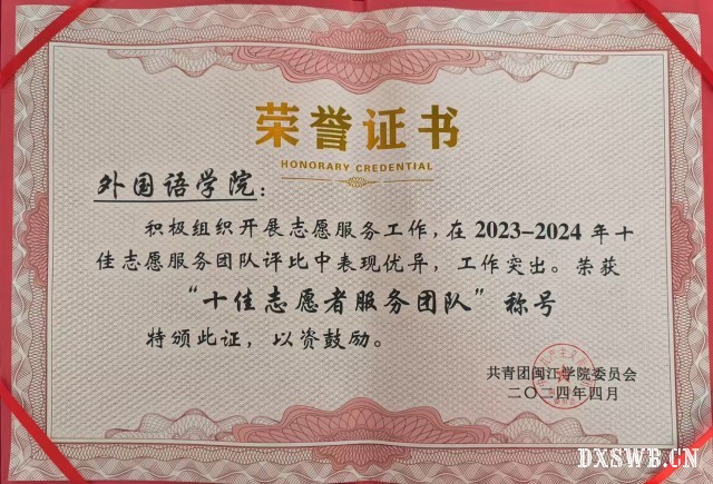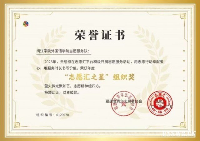 三年的志愿服务之路,他们收获了无数感动与成长。闽江学院外国语学院志愿服务队多次获得校级十佳志愿服务团队荣誉称号,多名志愿者被评为“优秀志愿者”,并于2023-2024年度荣获“志愿汇之星“组织奖”!这些荣誉是对他们工作的肯定,更是激励他们前行的动力。与此同时,志愿者们在服务中锻炼了能力,提升了自我,收获了友谊与成长。