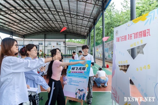图为毕业生们将纸飞机穿过祝福的孔洞