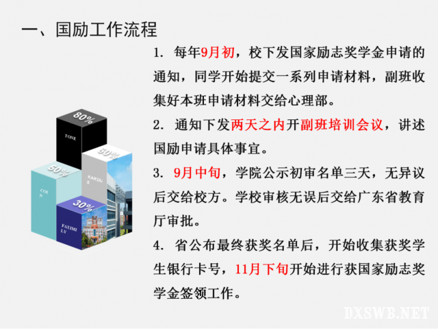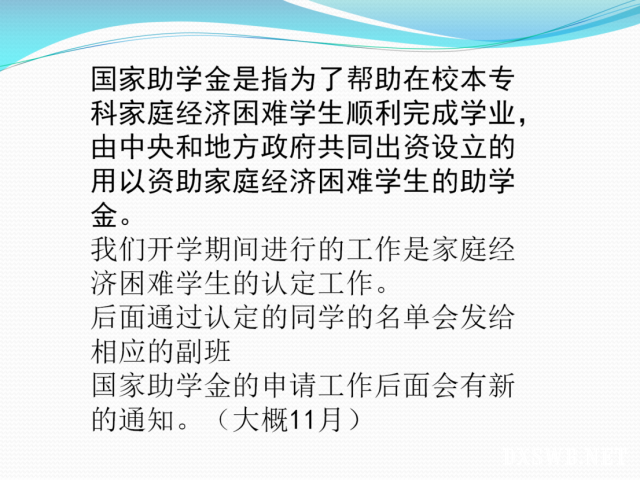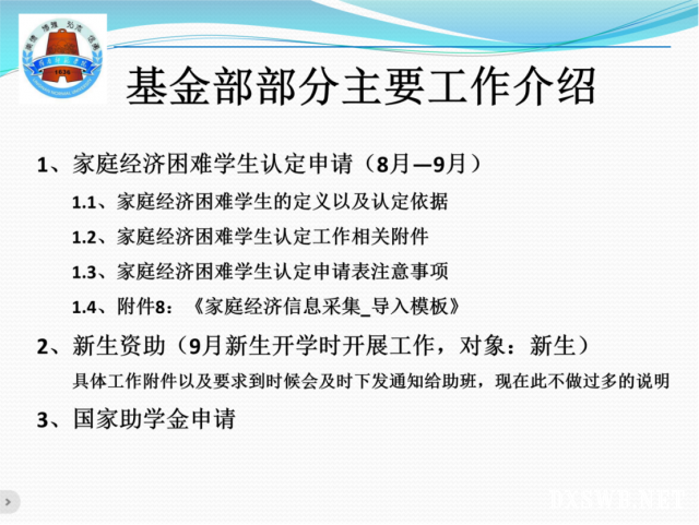 会议主要流程如下:1.主持人介绍资助工作须知;2.贷款部和基金部工作介绍与答疑;3. 三金的介绍和答疑;4.指导老师张茜发言。