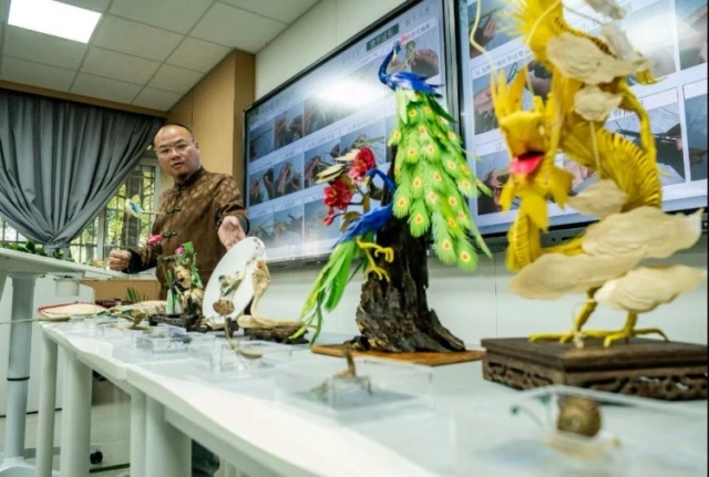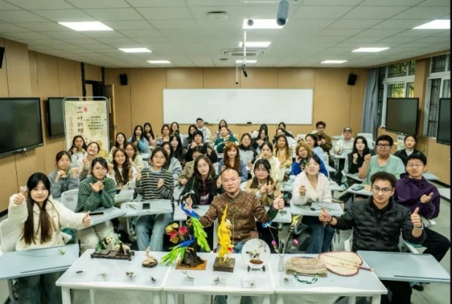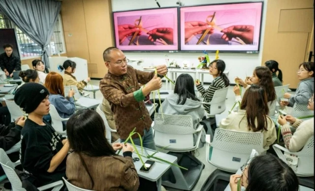 罗志勇以“一片棕叶,藏着老祖宗的生活智慧”为引,分享了自己数十年深耕棕编领域的从业经历。从年少时受街头棕编艺人启发,到潜心钻研传统技法并大胆创新,将民俗文化元素融入作品创作,使普通棕叶蜕变为兼具艺术价值与文化内涵的获奖珍品,其坚守与传承的精神赢得在场同学的广泛认同。