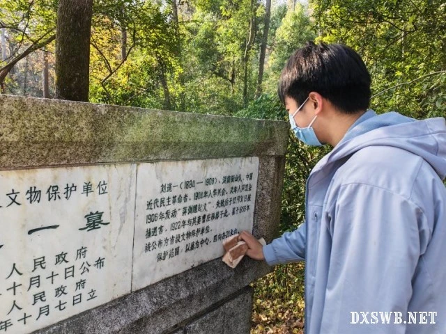 活动伊始,全体人员肃立默哀,志权委员代表班级敬献花篮,并带领同学们行鞠躬礼。随后,同学们分组清扫墓园落叶、擦拭墓碑,以实际行动表达对先辈的崇高敬意。墓呈半圆形,底径3米,高0.5米,茔地及坟堆皆以花岗石铺砌。墓后立碑三通,主碑刻谭延闿书"烈士刘道一曹庄墓"八字,左右附碑刻刘道一胞兄刘揆一所撰碑记。