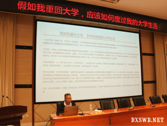 10月17日,学院邀请南充市政协副主席郭宗海在思学楼 A114 举办“假如我重回大学,应该如何度过我的大学生活”主题报告会。为学子分享大学生活规划之道。学院党委书记曾有为主持会议。